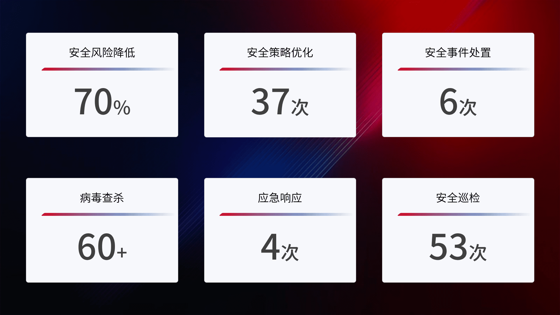综合报告与文档服务: 定期提供安全事件处置报告、、、、周/季度总结报告和年度总结报告;详尽的文档服务可帮助客户了解网络安全状况,,,,支持决策制定和流程优化。。。